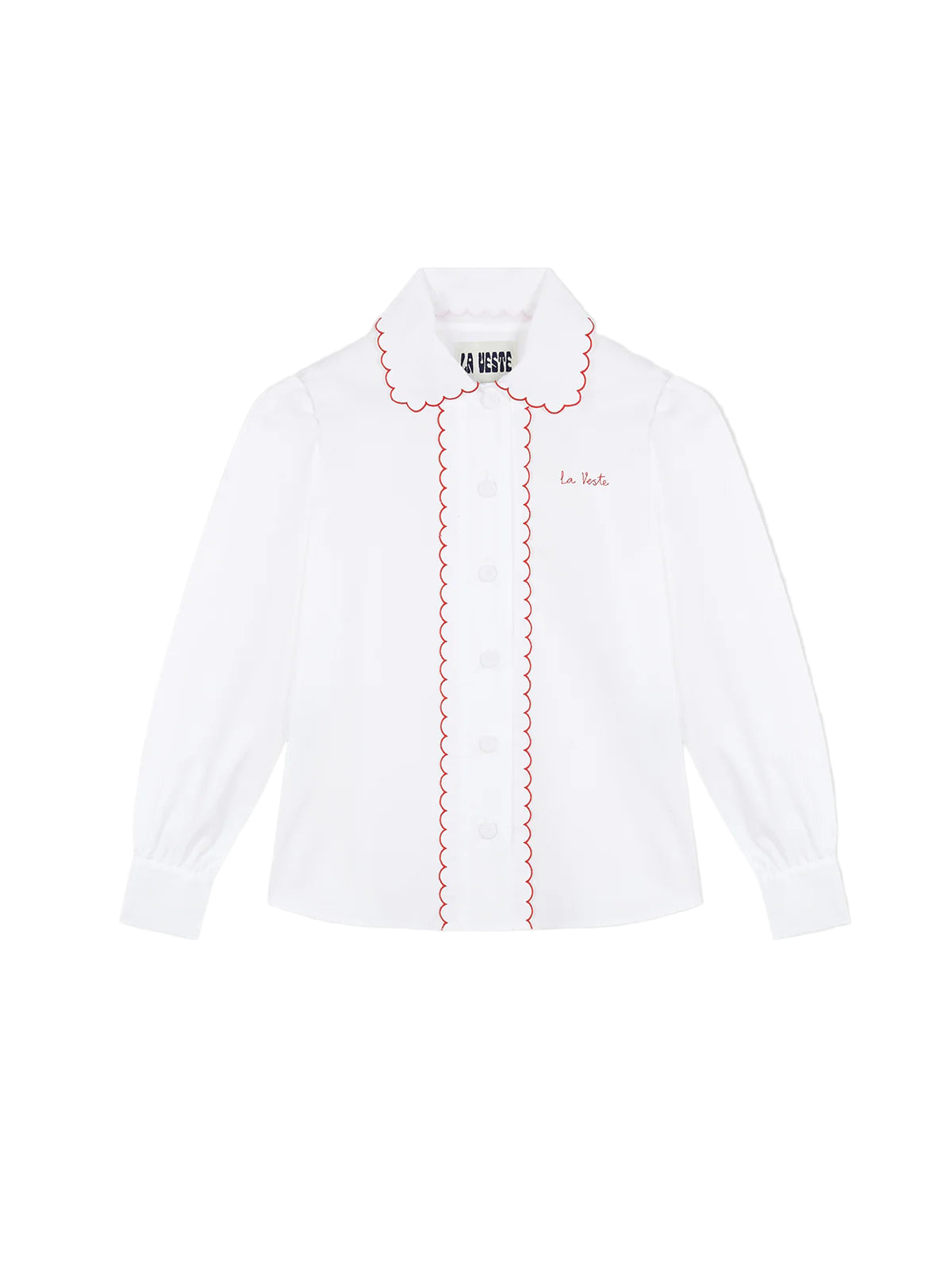 Shirt made of white cotton with red embroidered logo and red finishing details.