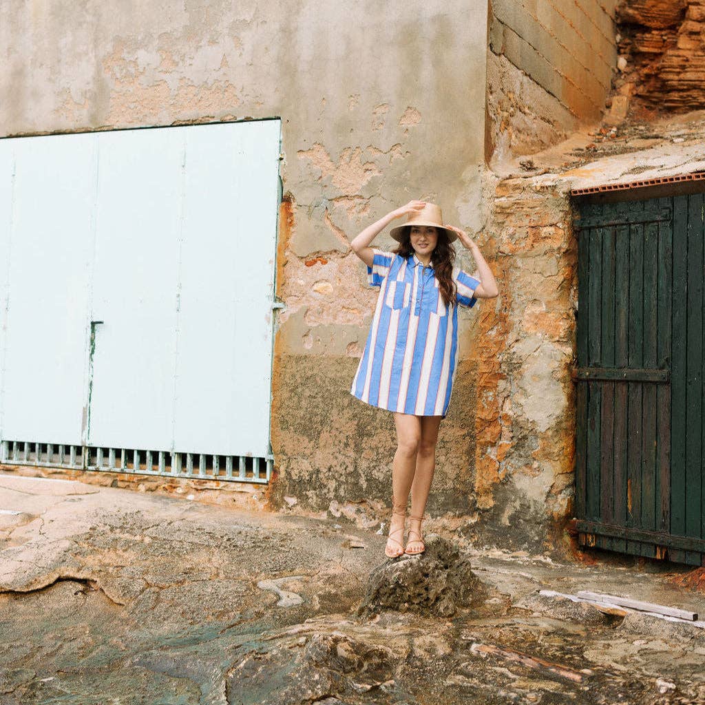 The Cabana Stripe Getaway Mini Dress features bold blue and white stripes accented with playful pops of red and yellow for a vibrant, summery vibe. With its relaxed fit, short sleeves, and functional front pockets, it’s perfect for effortless style on sunny adventures.