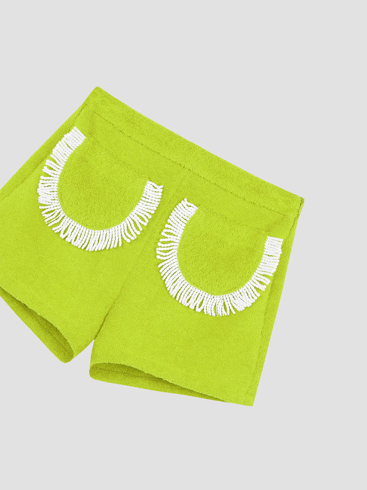 Pistachio towel shorts featuring two front pockets with fringes. Made from 100% cotton.