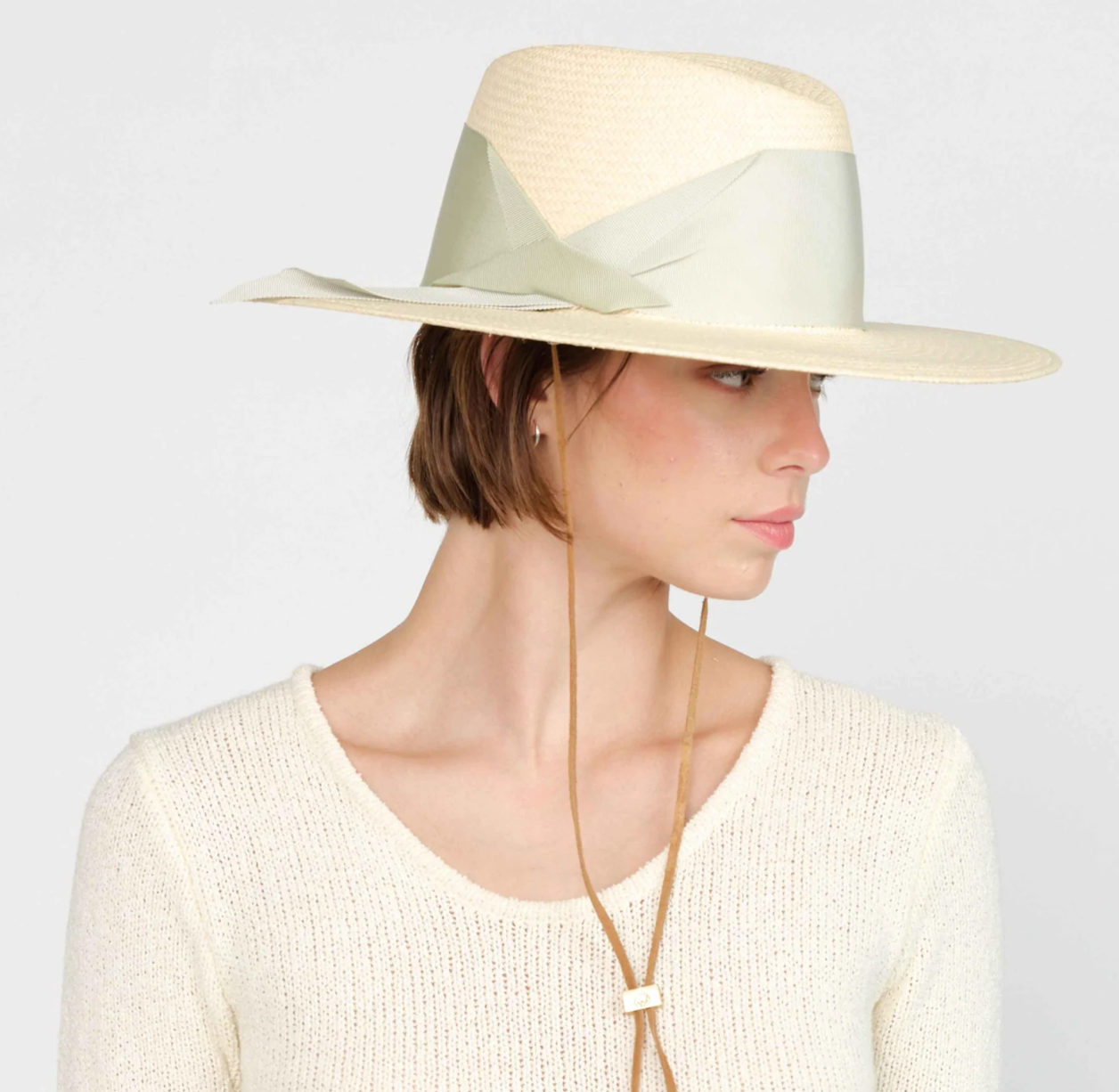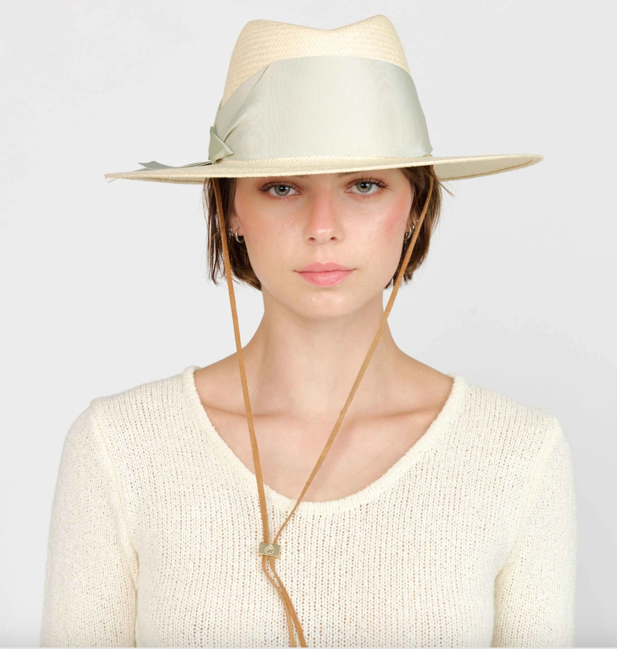 This hat is an updated version of our perennial bestseller, the Gardenia. Featuring our newest crown shape with a distinct center crease along the top of the crown and bone leather chin strap, the hat is decorated with an oversized moss/melon grosgrain band, wrapped asymmetrically and finished with a modern angular fold.