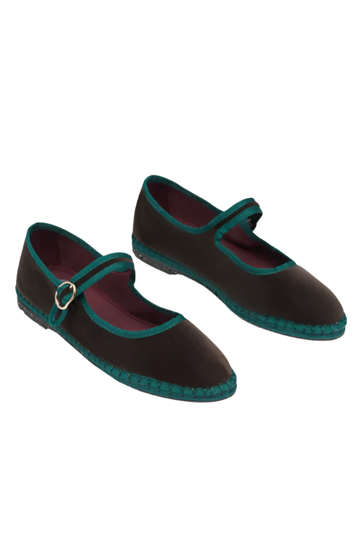 - Velvet mary jane in dark brown with green piping and buckle closure.
