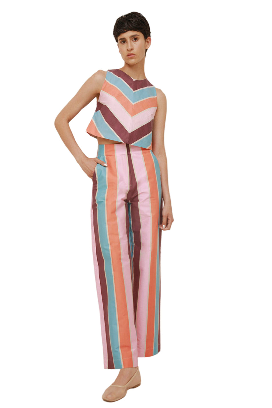 Featuring a high-waisted fit and a flared silhouette, this design boasts a captivating pattern of colorful lines that exudes effortless elegance. Whether paired with a crisp blouse or a casual knit, these pants will bring an artistic touch to any ensemble.