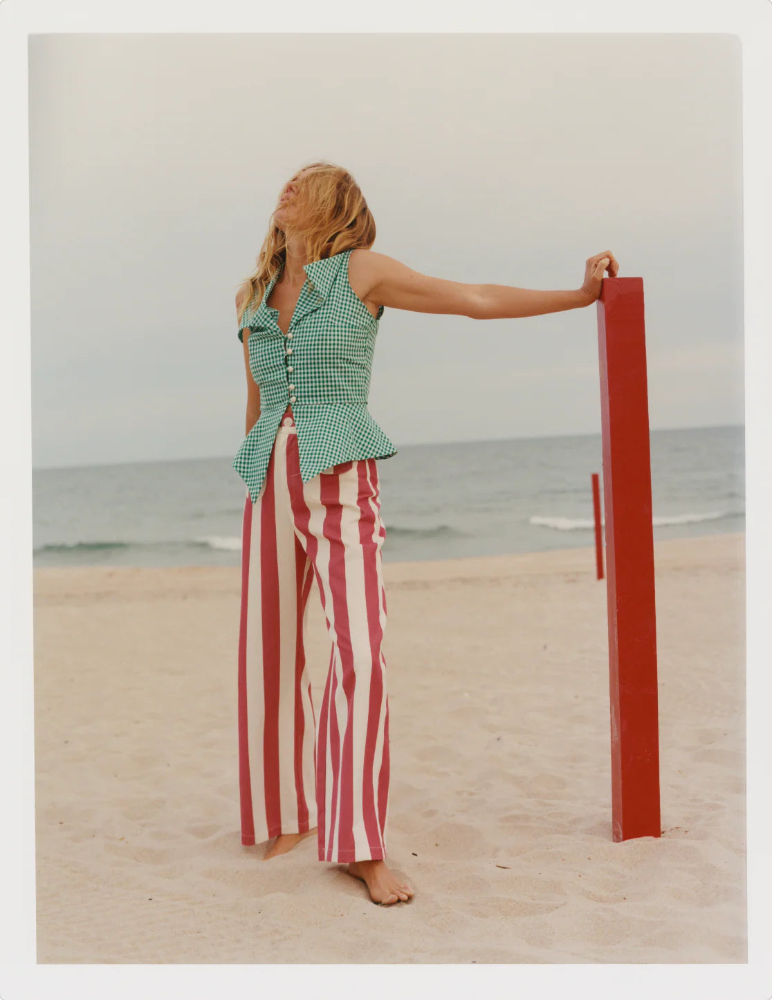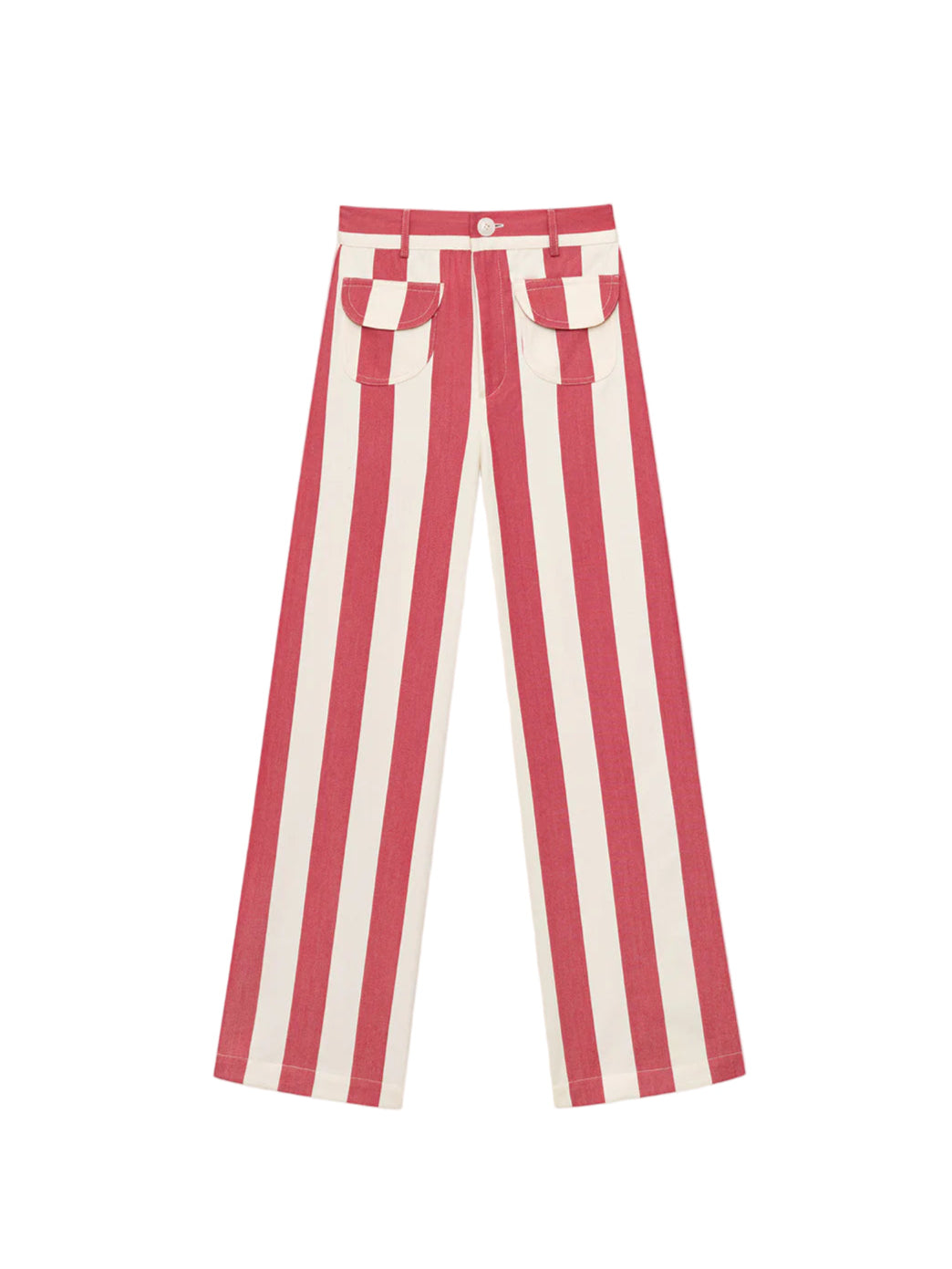High-waisted trousers printed in cotton with red and ecru stripes.