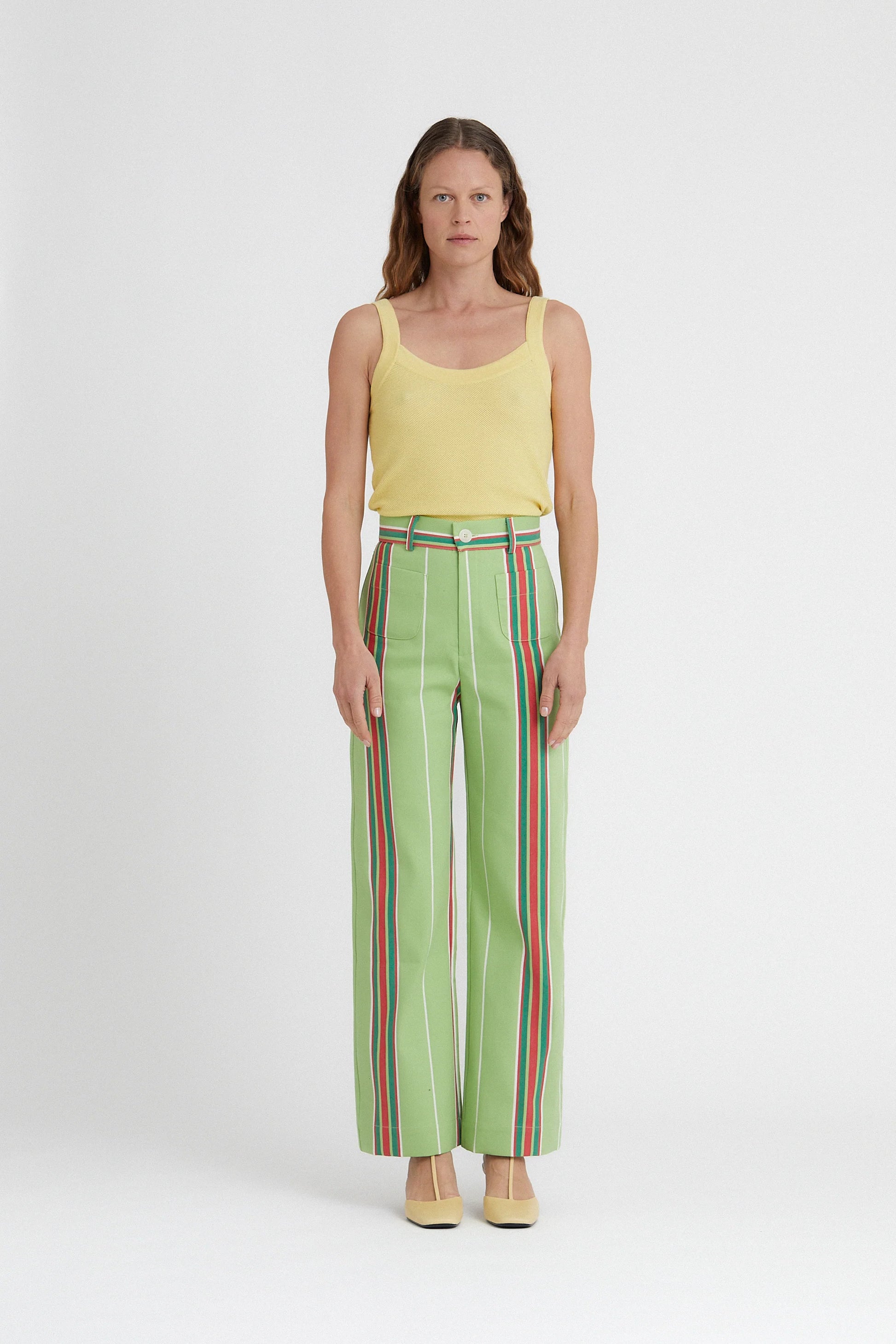 Pink high-waisted printed trousers in cotton with red and green stripes.
