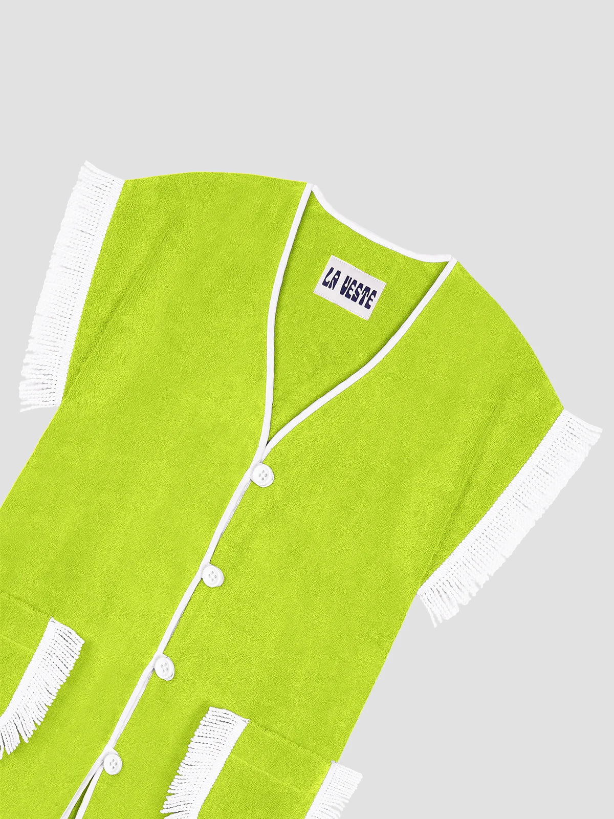 Lime short towel dress with white fringe details along the shoulders and front pockets.