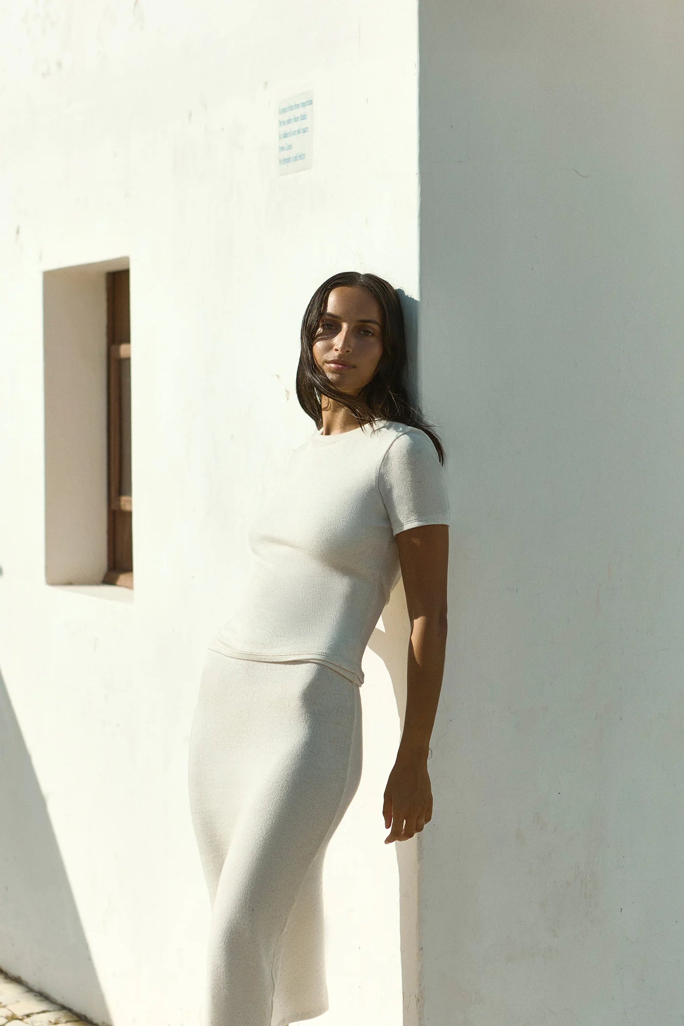 The uncomplicated ease of our Rey Midi Skirt makes this an essential addition to any summer wardrobe. The distinctive length and simple silhouette, in our new natural tencel linen knit fabric, are a streamlined update to this timeless style. Wear it over your bikini or pair it with the matching Short-Sleeve T-shirt in Tencel linen knit for an easy summer set that goes from beach to town.