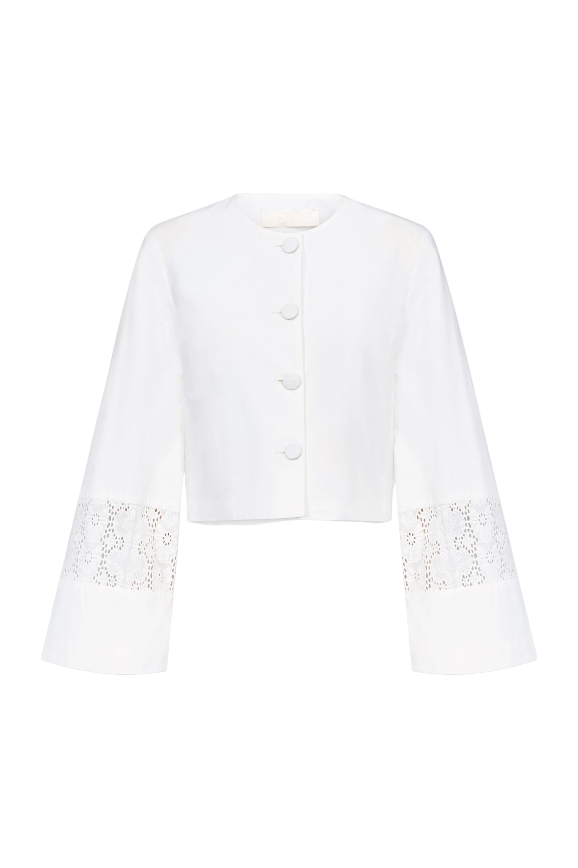 The Summer Jacket is crafted in crisp white cotton with a clean, cropped silhouette softened by delicate eyelet embroidery at the sleeves. Its round neckline and covered buttons create a refined balance between structure and lightness.
