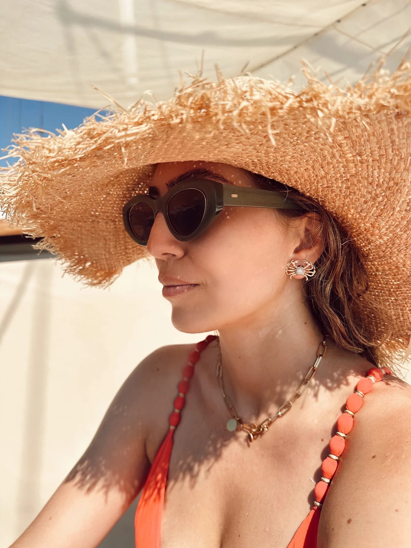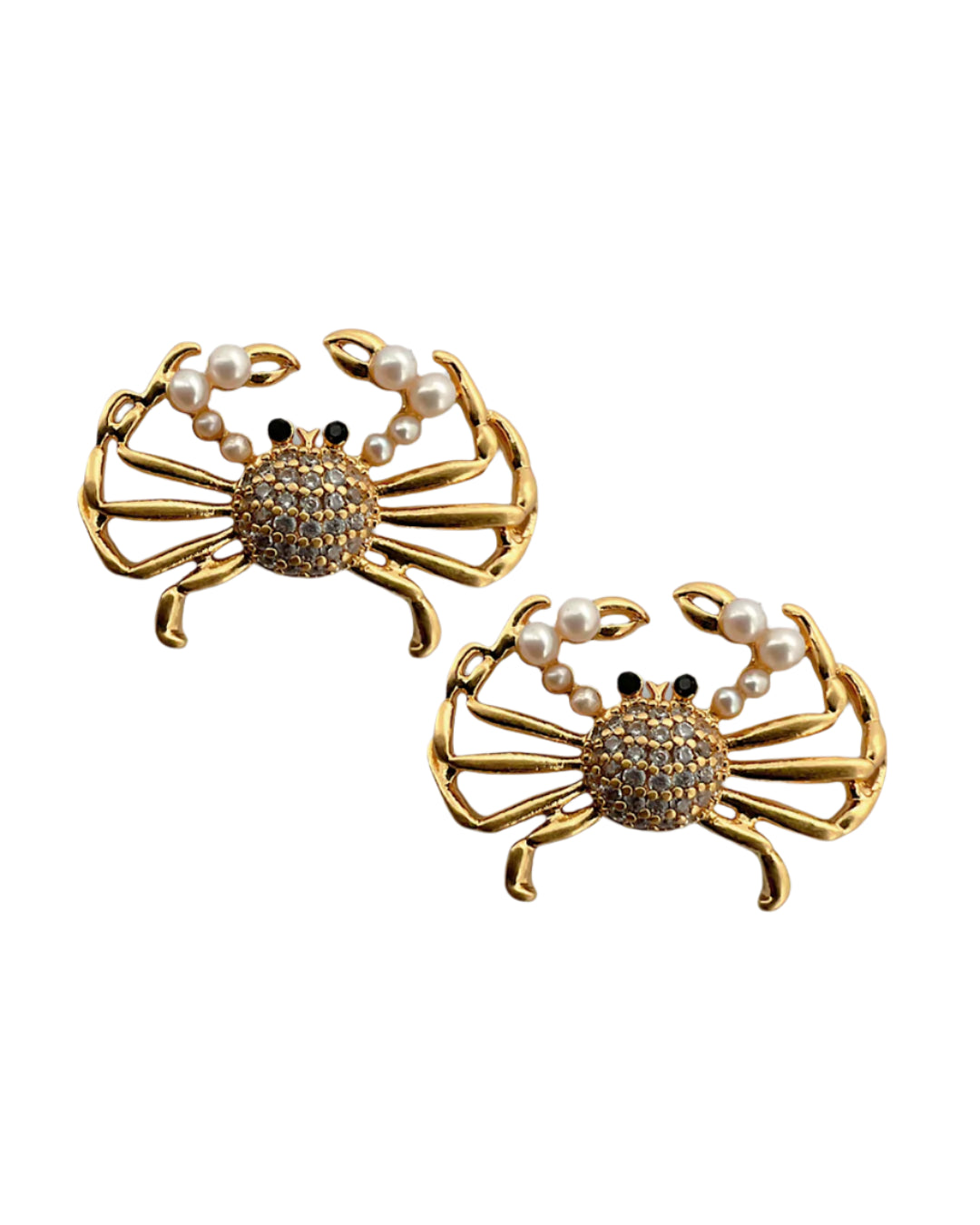 Crafted with 18K gold plating, these earrings feature intricate crab motifs with freshwater pearls. The design captures the essence of coastal charm and those always chasing the sun.