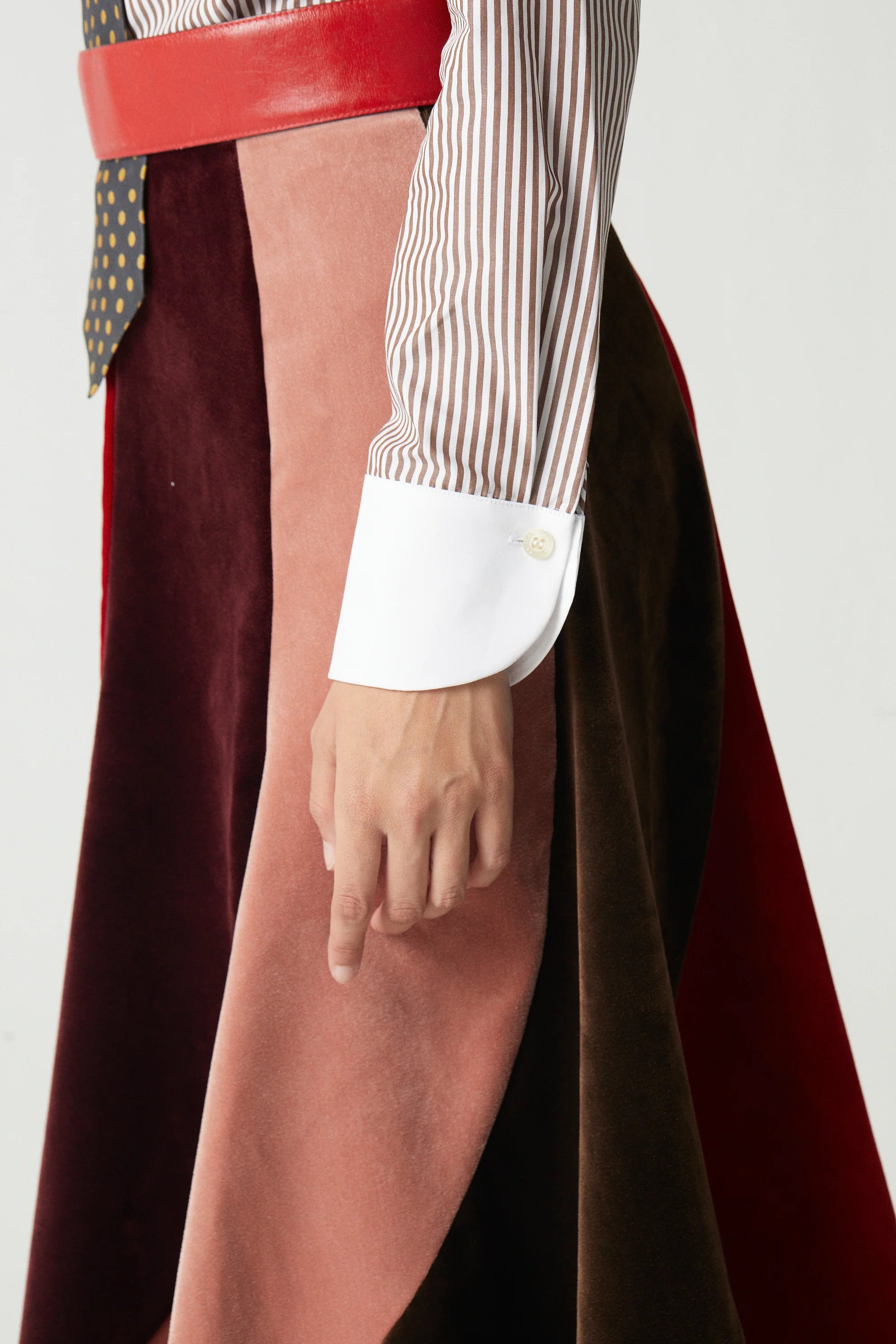 - Long sleeves with buttoned white cuffs.