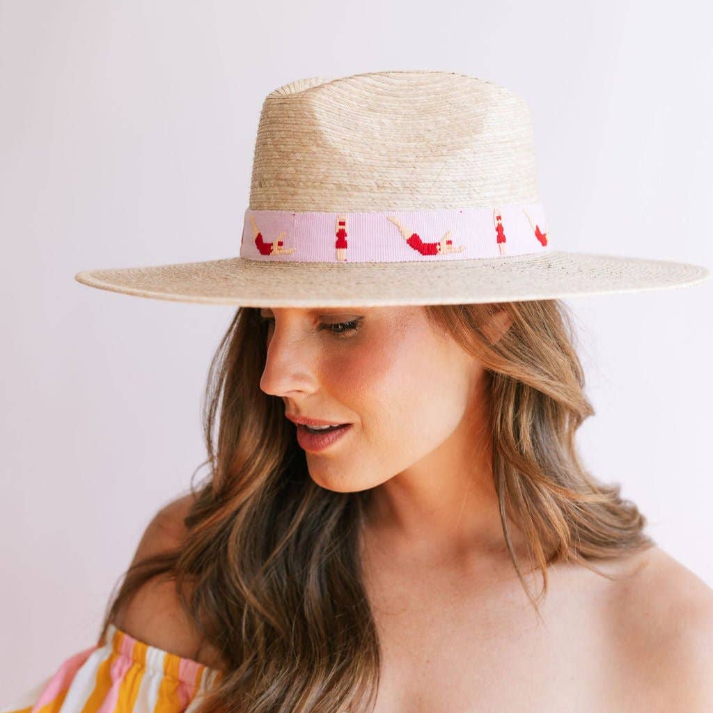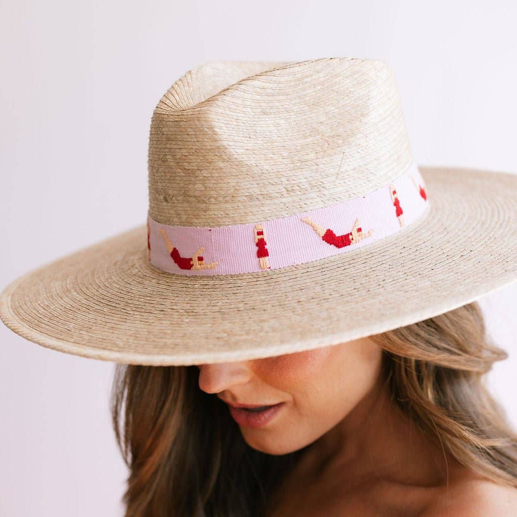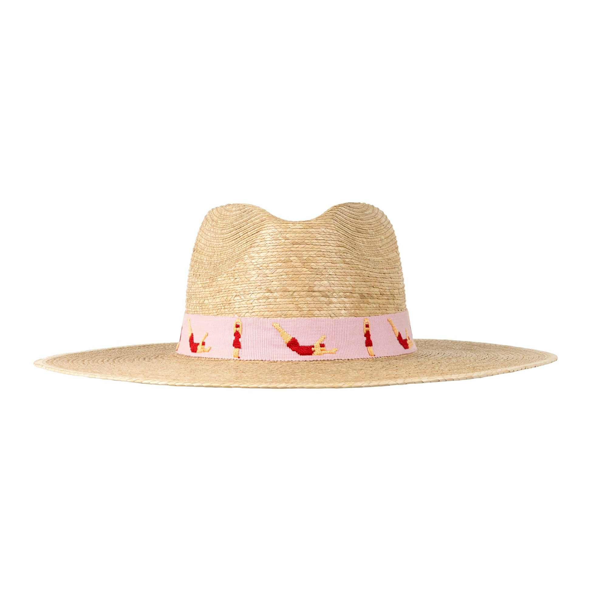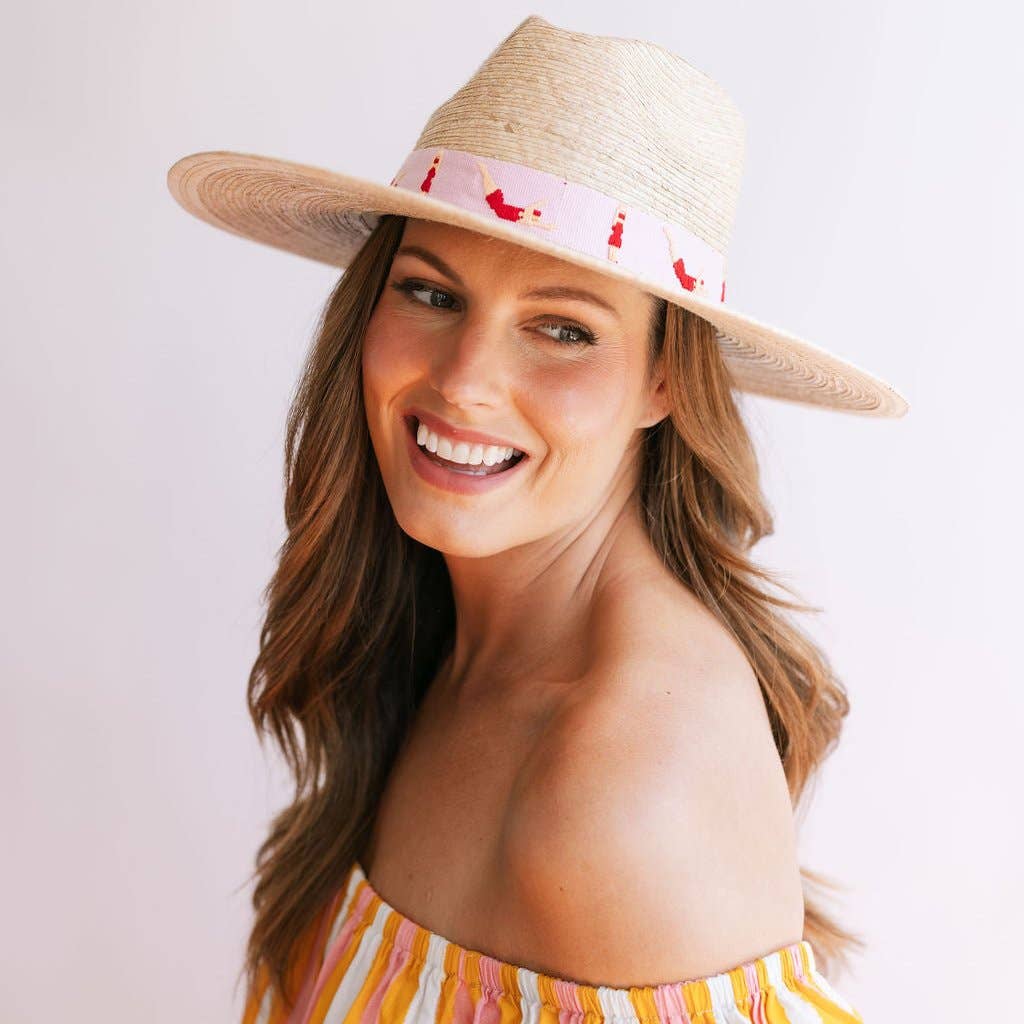 The Swimmers Palm Hat features a pink cotton band with embroidered swimmers and is a part of our sustainable, fair trade hat collection and graded at the highest UPF rating. Details: Permanent woven band attached to crown of hat Colors: Pink, red, tan Hat Brim measures 3 3/4" wide Crown of hat measures 4 1/2" tall