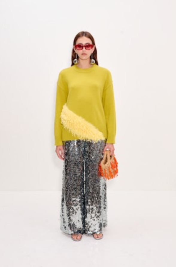 Long sleeve knit sweater made from an embellished wool-blend yarn in chartreuse. Features a statement feather band across the front and a relaxed, easy fit that’s not too oversized.